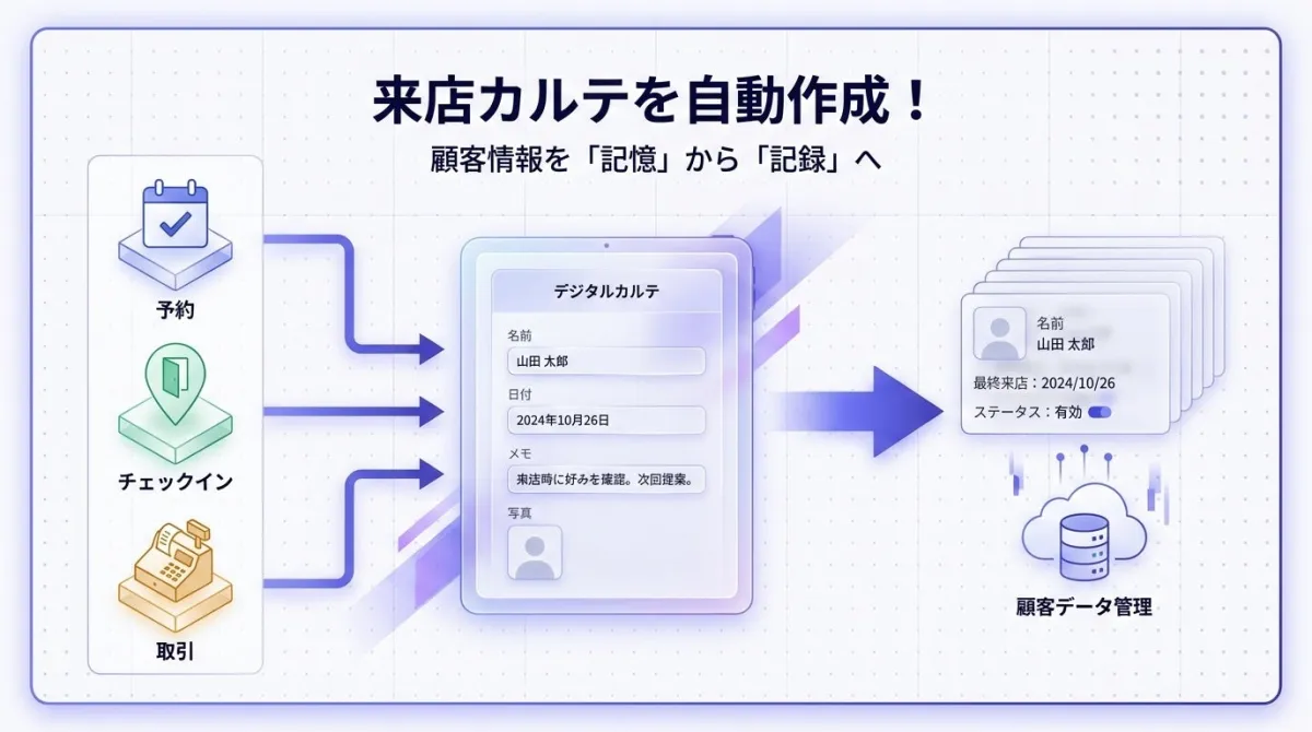自動生成機能: 予約、チェックイン、会計のトリガーに応じて、自動的に顧客カルテが作成されるため、手動での入力作業が不要になります。