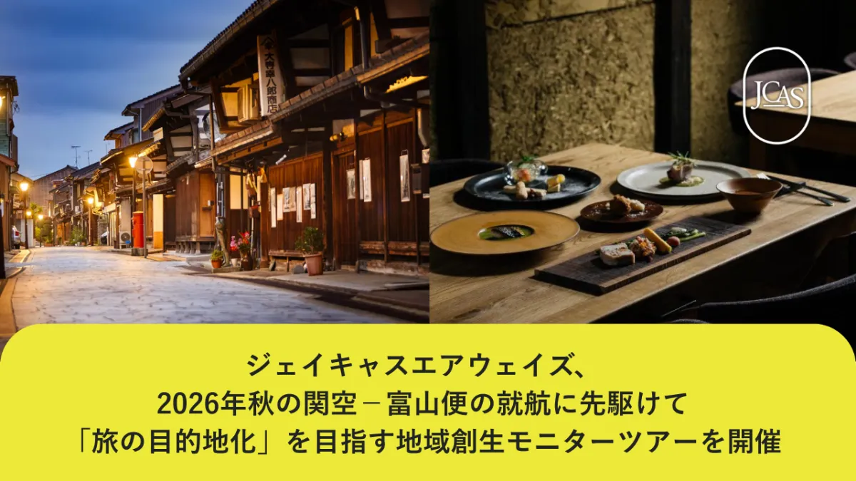 株式会社ジェイキャスエアウェイズ(JCAS)が、2026年秋に計画されている関西国際空港と富山空港を結ぶ新規路線の就航に先駆けて、地域創生の一環として「山から海へ、水が紡ぐ富山の食と文化の物語」というテーマのもと、特別なモニターツアーを実施します。本ツアーは2025年11月21日から23日の間に行い、就航予定地の魅力を体験を通じて探る機会です。これは、単なる交通手段ではなく、旅の目的地としての価値を見出すことを目指しています。