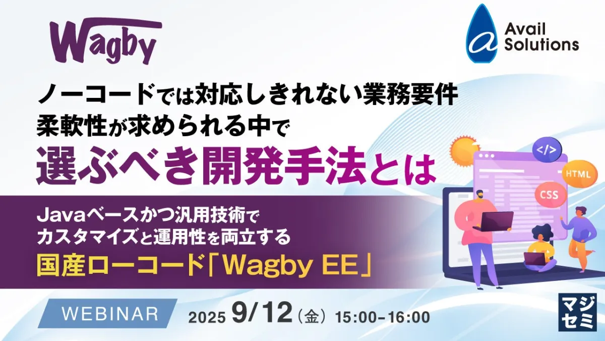 そんな中、注目を集めるのが国産ローコード開発ツール「Wagby EE」です。このツールは、Javaベースで汎用技術に基づいたアーキテクチャを持っており、実際の業務に即したカスタマイズ性が特長です。本セミナーでは、Wagby EEの柔軟な機能や内製運用における実践的な活用方法を解説します。特に、他のノーコードツールとの具体的な比較を通じて、そのメリットをより深く理解していただきます。