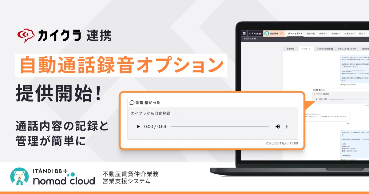 この機能は、「自動通話録音オプション」として知られ、賃貸仲介業務における電話やSNS、メールを通じたコミュニケーションを一元管理することを目的としています。2025年4月から提供が開始され、仲介会社と入居希望者の通話内容が自動的に「ノマドクラウド」に記録されます。
