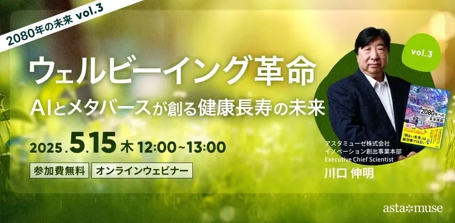 2025年5月15日、著名な著者である川口伸明氏がアスタミューゼ株式会社の主催でウェビナー「ウェルビーイング革命:AIとメタバースが創る健康長寿の未来~2080年の未来シリーズvol.3~」を開催します。このウェビナーでは、未来の技術がどのように私たちの健康と幸福に寄与するのかについて詳しく議論されます。