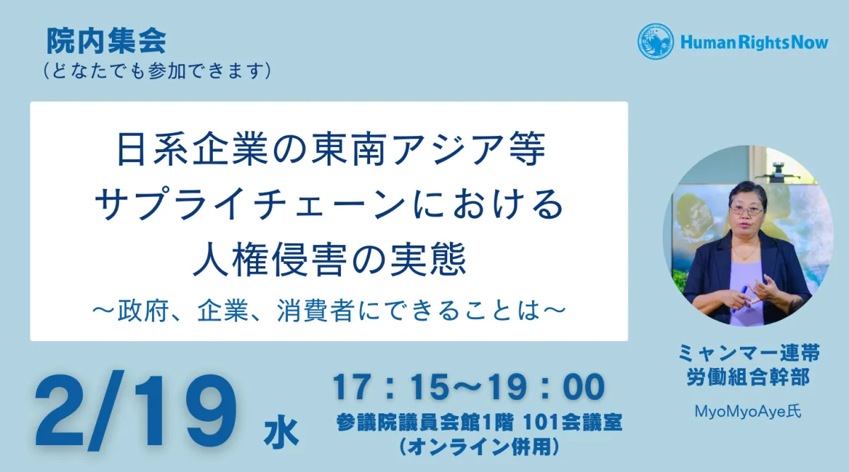 このような背景を受けて、2月19日(水)には、院内集会を開催します。このイベントでは、Myo Myo Aye氏をはじめとする特別ゲストが登壇し、人権侵害の実態及びそれに対して政府、企業、そして消費者が何をするべきかを考える機会となります。参加は無料で、会場での参加に加え、オンラインでも参加可能です。