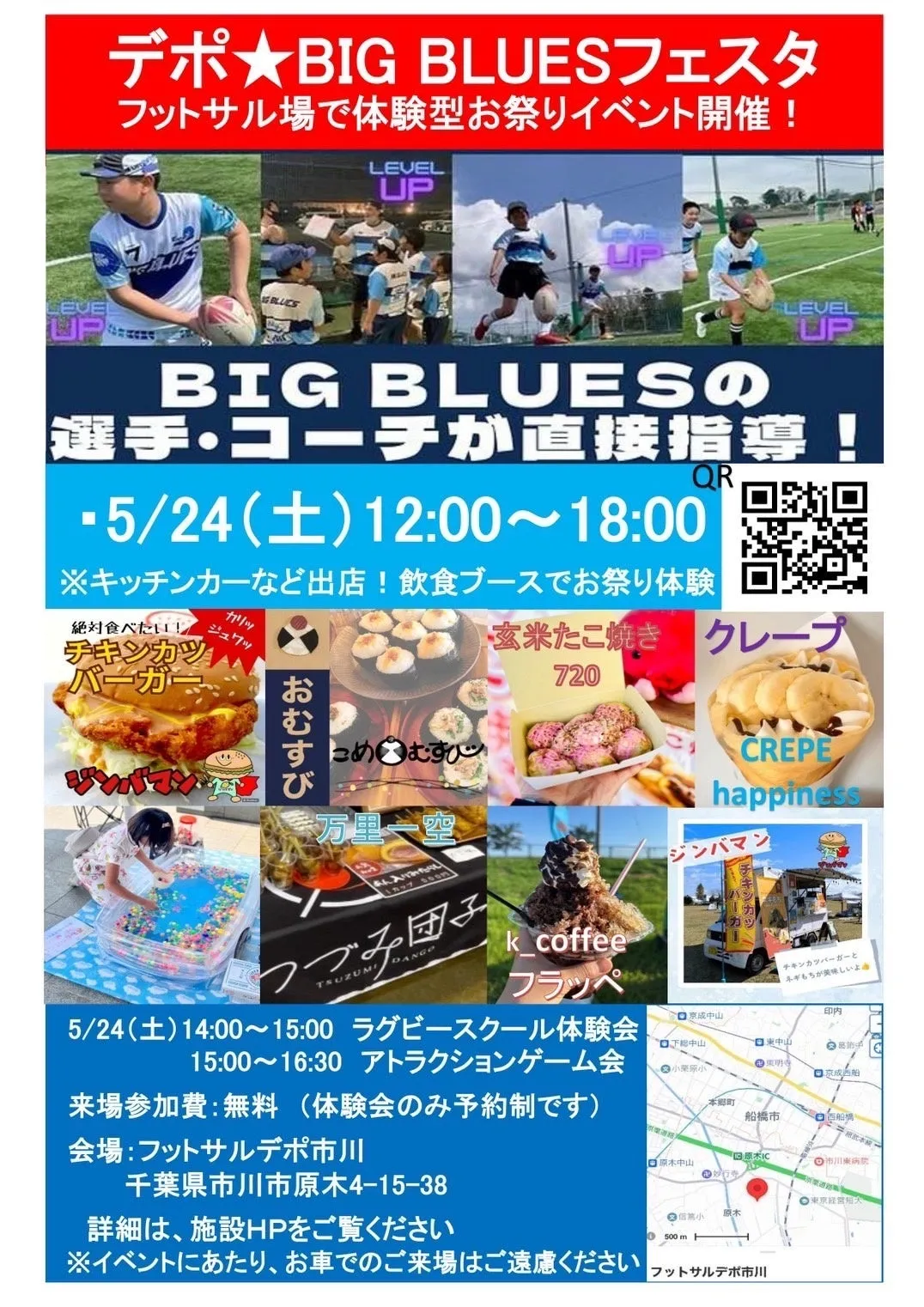 5月24日(土)、千葉県市川市で開催される「デポ★BIG BLUESフェスタ」は、ラグビー選手やコーチと直接ふれあえる貴重なチャンスです。このイベントでは、BIG BLUESの現役選手とともにラグビーの体験ができるだけでなく、幼児から大人まで楽しめる多様なアトラクションゲームも用意されています。