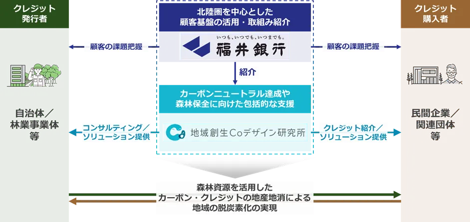 福井銀行は北陸圏に強い顧客基盤を有し、森林を所有する顧客や脱炭素経営を志向する企業が多数存在します。一方、地域創生Coデザイン研究所は、地域資源を活用したカーボン・クレジットの創出に長年取り組んできました。2社の連携により、森林管理に関する課題の把握やサポートが可能になります。特に、福井銀行の顧客基盤に向けて、地域創生Coデザイン研究所がコンサルティングを提供し、企業や地方公共団体のカーボン・オフセットニーズに応えます。