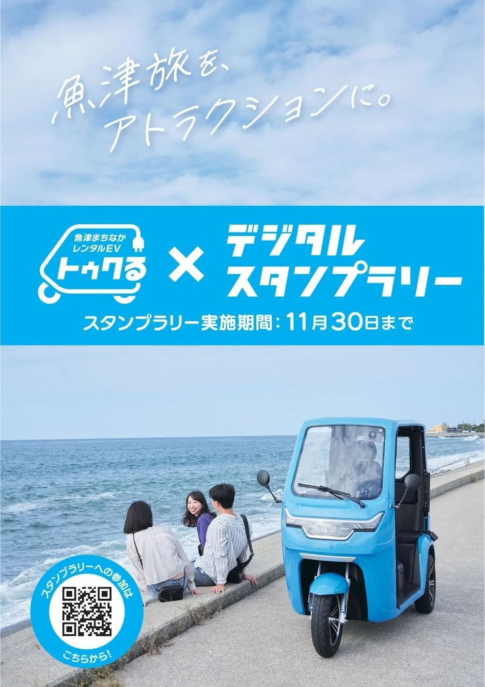参加者は、スタンプラリー冊子に記載されたQRコードを読み取ることでイベントに参加できます。トゥクトゥクに乗って、魚津市内を探検し、指定されたスポットにあるデジタルスタンプラリーのQRコードをスキャンすることでスタンプをゲットします。
