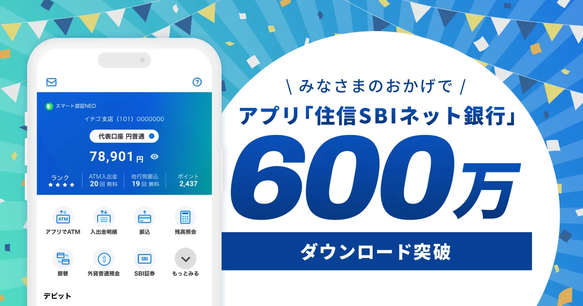 住信SBIネット銀行、アプリのダウンロード数600万を突破!