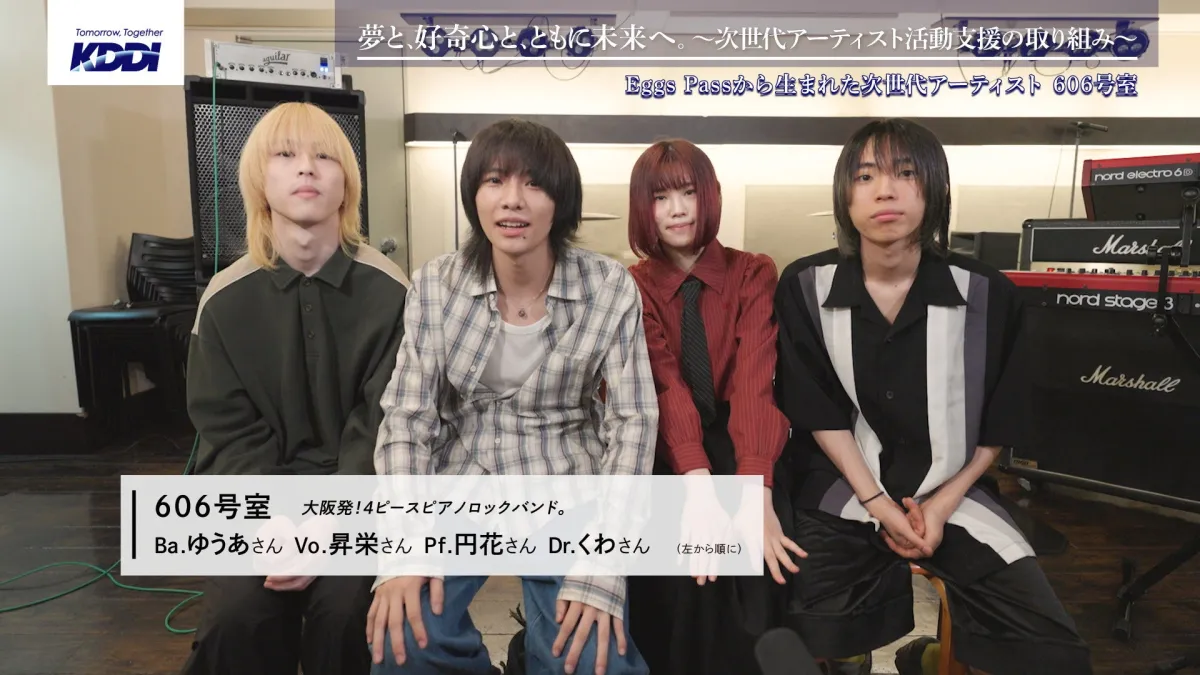 「Eggs」は、インディーズアーティスト向けの音楽活動を支援するプラットフォームで、約3万組のアーティストと60万人以上のリスナーが利用しています。606号室もその一員として、KDDIの協力を通して活動を拡大し、アーティストとファンの出会いを増やしていくことが目指されています。エッグスは、音楽フェスやライブイベントの実施、様々なメディアと連携したプロモーションを通じて、音楽シーンの未来を切り拓いていく所存です。