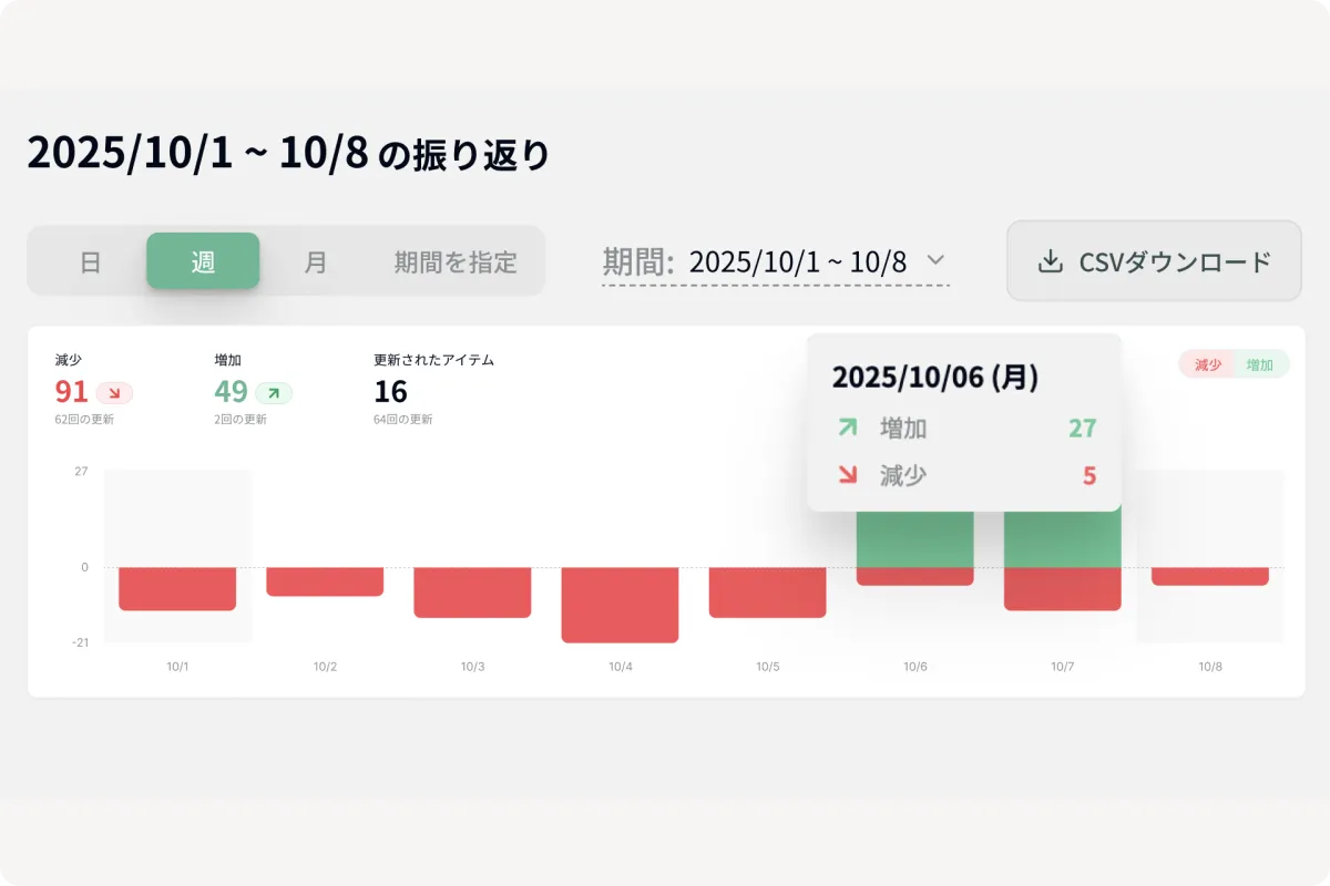 週次レポートにより、各商品の売上や出庫数が視覚化されます。「よく減る商品」や「動きの鈍い商品」を一目で特定することができ、的確な管理をサポートします。これにより、在庫切れの防止や過剰在庫の削減のための対策を即座に行えます。