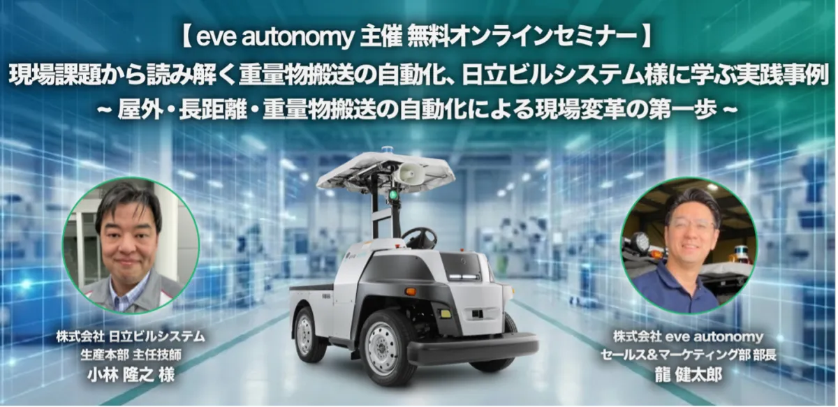 2026年3月25日(水)と3月26日(木)、株式会社eve autonomyが主催する無料オンラインセミナーが開催されます。このセミナーでは、株式会社日立ビルシステムの担当者をゲストに迎え、屋外や長距離における重量物の自動搬送に関する実践事例が紹介されます。
