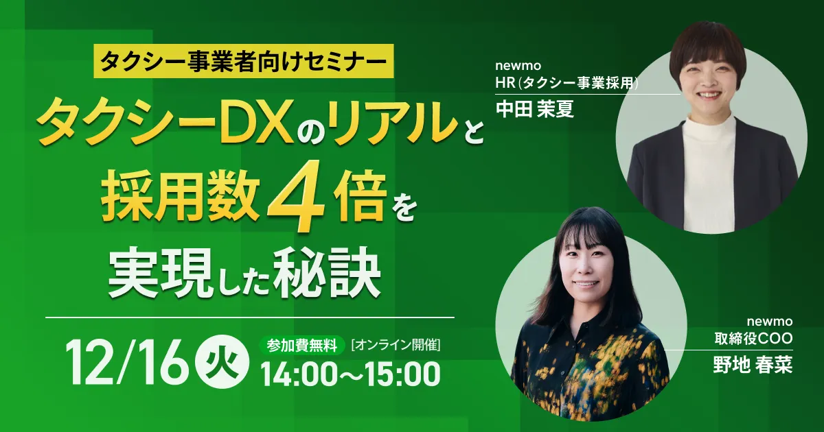 新たなタクシー業界の変革を目指すため、newmo株式会社は2025年12月16日(火)にオンラインセミナー「タクシー業界の変革最前線 ― タクシーDXのリアルと採用数4倍を実現した秘訣」を再び開催します。本セミナーは、10月31日に放送されたテレビ東京系列の番組「ガイアの夜明け」で取り上げられたタクシー業界のDX(デジタルトランスフォーメーション)や、採用数を劇的に増やした実践的な取り組みを紹介する機会です。