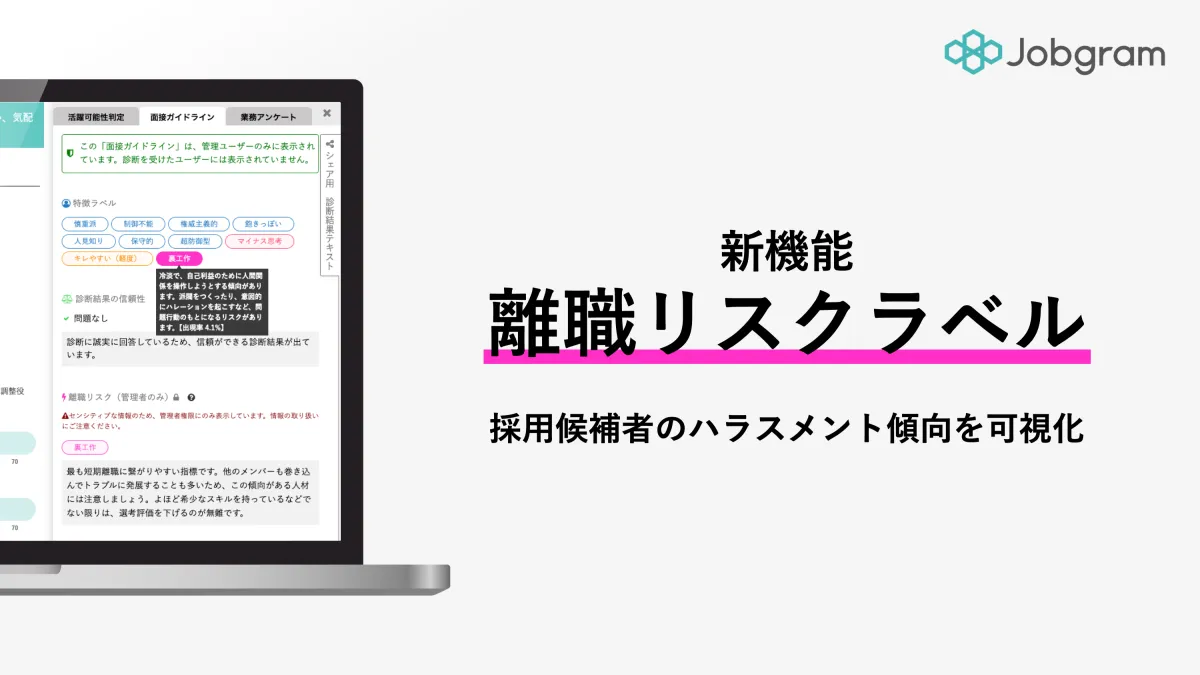 東京都渋谷区に本社を置くグラム株式会社は、同社が手がける適性検査クラウド「Jobgram」に新たな機能「離職リスクラベル」を導入した。この機能は、採用候補者の性格特性を分析し、早期離職や組織内トラブルのリスクを視覚化することを目的としている。