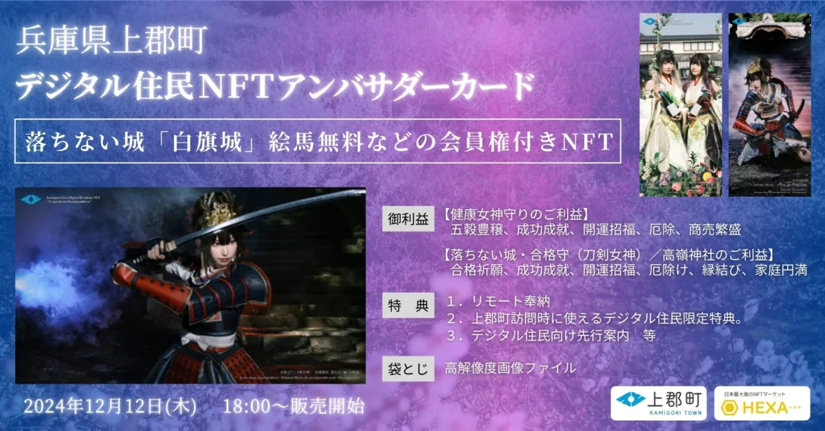 2024年12月12日(木)から、日本国内で最大規模を誇るNFT市場であるHEXAにて、会員権に特化した「デジタル住民NFTアンバサダーカード」の販売を開始します。このカードは一つのデジタル資産でありつつ、特定の特典を享受できるというユニークな仕組みを持っています。