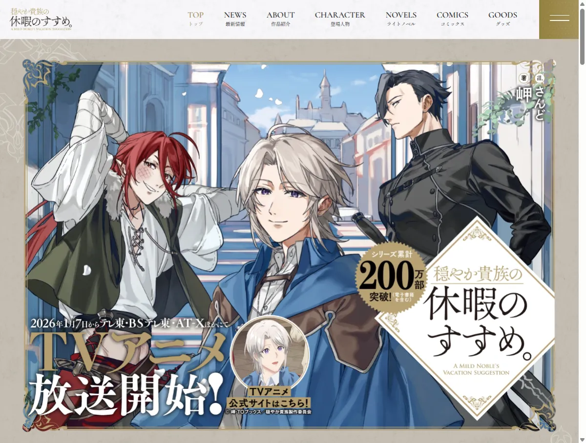 『穏やか貴族の休暇のすすめ。』のファンにとって朗報です!2025年12月22日に、株式会社TOブックスが原作特設サイトを大幅にリニューアルオープンしました。このリニューアルは、2026年1月から放送予定のTVアニメに向けたもので、作品の魅力を一層伝えられるようにデザインが一新されています。特設サイトでは、新たにメディア展開の情報や各キャラクターの紹介が豊富に加わり、より多くの情報を一望することが可能です。