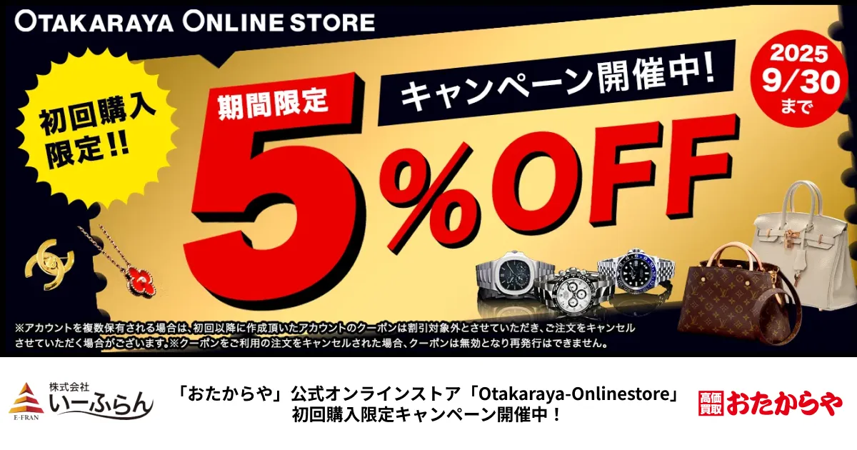 株式会社いーふらんが運営する「おたからや」は、公式オンラインストア「Otakaraya-Onlinestore」で初回購入者向けの特別キャンペーンを展開中です。このキャンペーンを利用すると、購入時に5%の割引が適用されるため、ブランド商品の購入をお得に楽しむことができます。
