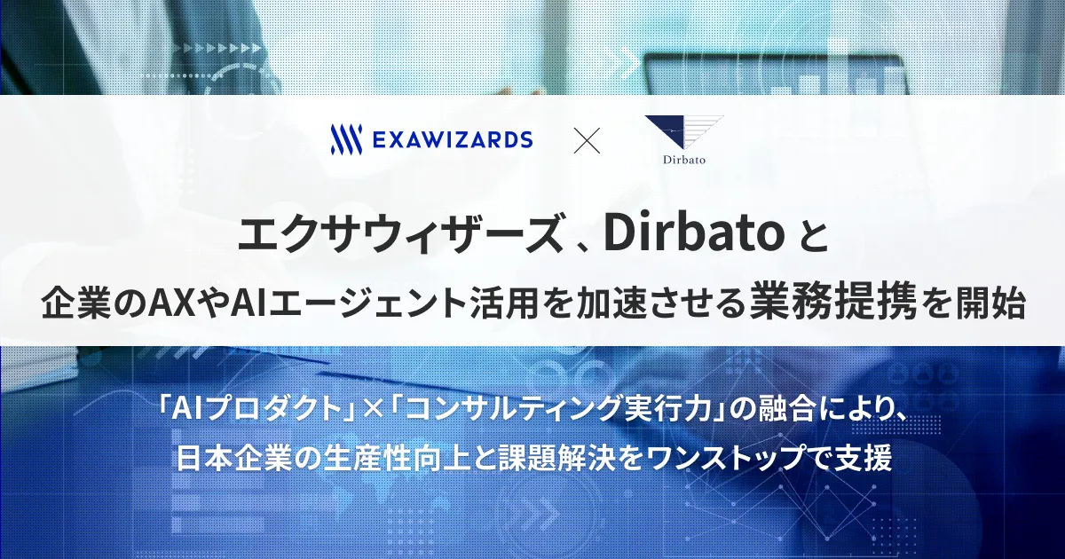 株式会社エクサウィザーズ(以下、エクサウィザーズ)と株式会社Dirbato(以下、Dirbato)は10月、企業のAI活用を支援するための業務提携を発表しました。この提携により、両社はそれぞれが持つ技術や知見を結集し、企業のAX(AIトランスフォーメーション)やAIエージェントの実装を一層強化します。
