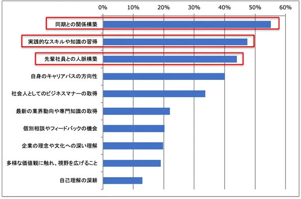 新入社員研修では、同期や先輩社員との関係構築が55%で最も重視されるという結果が出ました。企業がこの点を重視する背景には、職場における早期適応を促進する必要性があると考えられます。