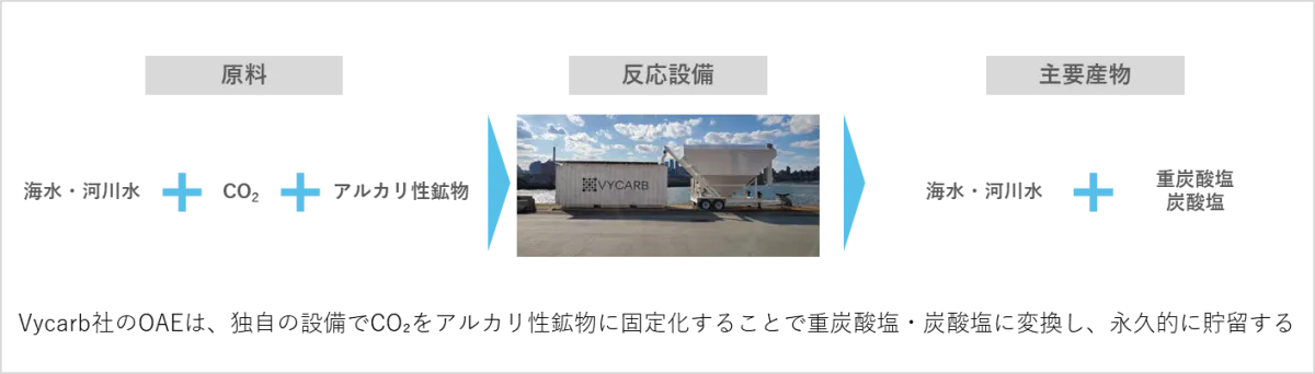 Vycarb社は、米国に本拠を置くスタートアップで、海洋における炭素循環に基づいた新しいCO2の貯留と測定技術を開発しています。同社は、小型の設備を利用してアルカリ性鉱物と海水や河川水を反応させ、CO2を固定化するプロセスを推進しています。このプロセスでは、CO2を炭酸塩や重炭酸塩の形で貯留し、海や河川に放流することが可能です。