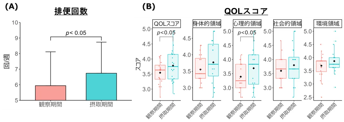 この研究では、便秘傾向がある18歳以上の男女21名を対象に、大豆ヨーグルトを1日100g、4週間継続的に摂取してもらいました。その結果、摂取前と比較して、排便回数や排便日数、量が有意に増加し、心理的なQOLスコアも向上したことが明らかになりました。
