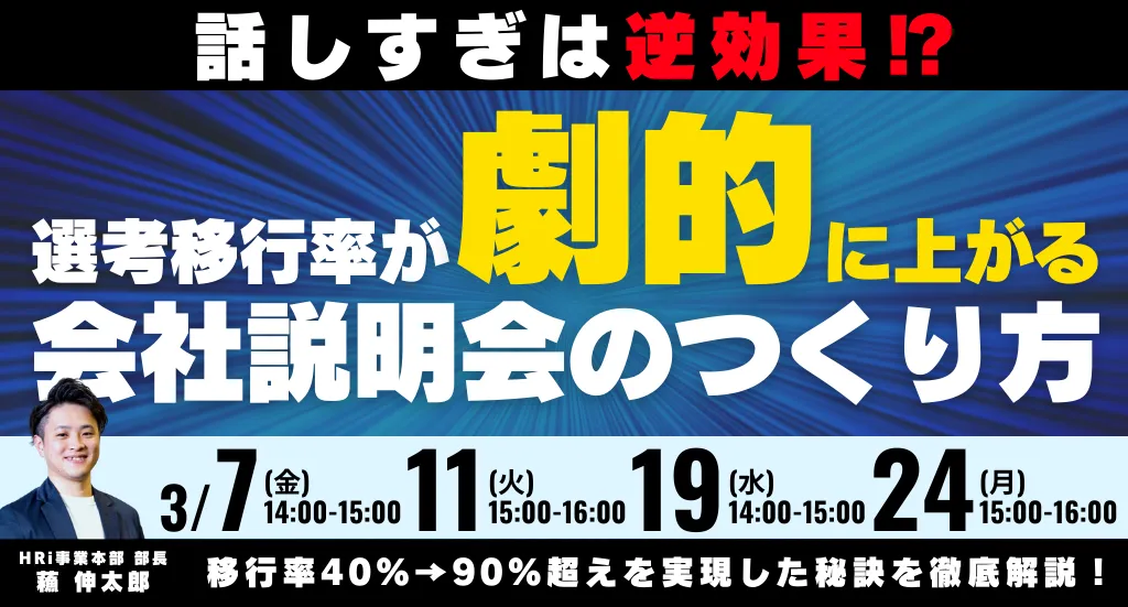 会社説明会は新卒採用において、非常に重要なステップです。しかし、情報を全て伝えようとするあまり、一方的な説明になってしまいがちです。この結果、学生は興味を失い、せっかく説明会に参加したにもかかわらず選考に進まないという事態が多く発生しています。本セミナーでは、学生が自然に関心を持ち、選考へ進むための「効果的な説明会作り」のノウハウを解説します。