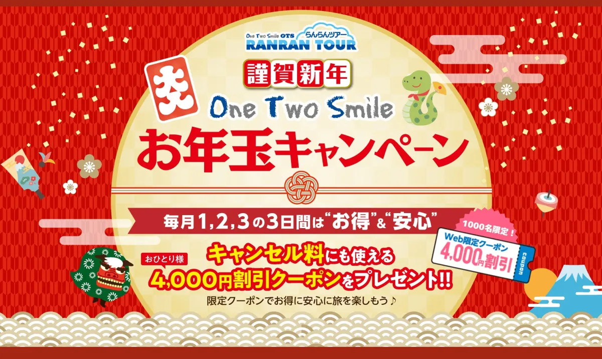沖縄を訪れる人々にとって嬉しいお知らせがあります。沖縄ツーリスト株式会社が提供する旅行専門サイト「らんらんツアー」で、毎月1日から3日の間に開催される「One Two Smileキャンペーン」が、大変お得な内容で実施されています。このキャンペーンでは、通常2,000円の割引クーポンが、1月の特別な新春お年玉セールにて4,000円割引となります。