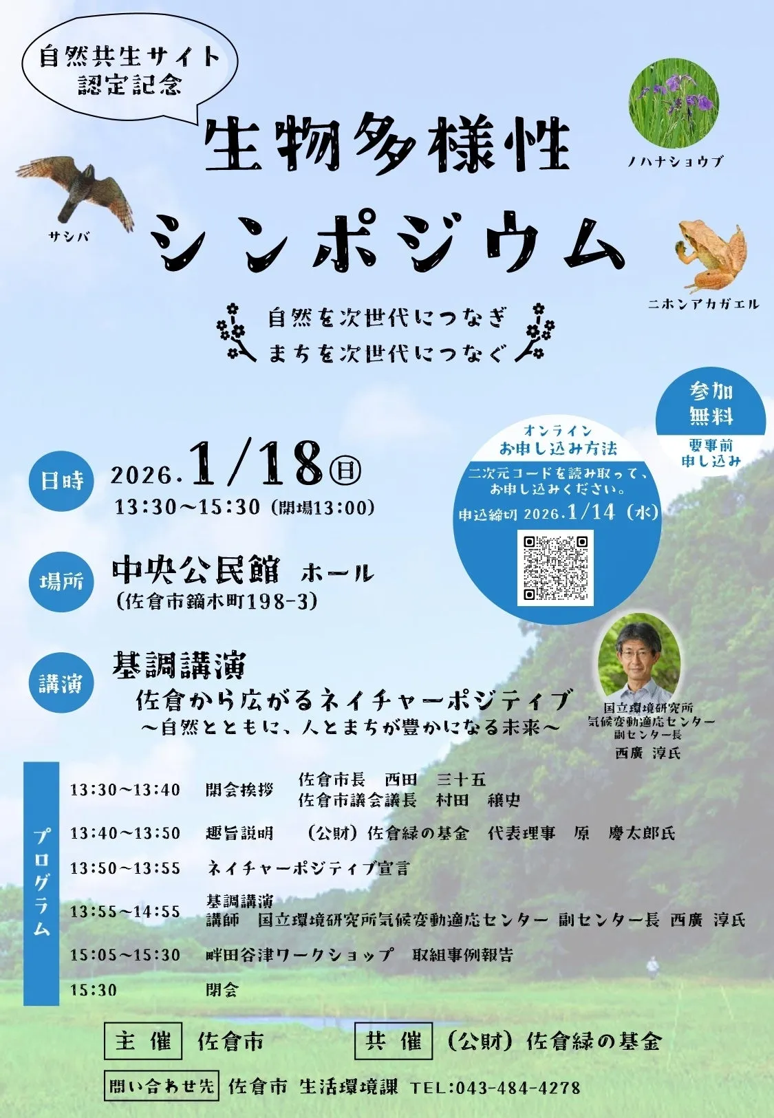 また、シンポジウムの中で「ネイチャーポジティブ宣言」が行われることも注目すべきポイントです。これは、佐倉市が「人と自然が共生するまち」を目指すための明確な方針であり、地域全体での生物多様性の保全に向けた強い意志を示すものとなります。