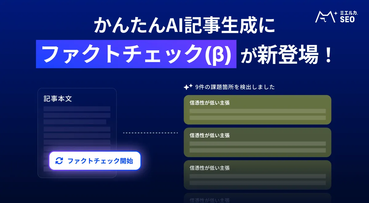 ファクトチェック機能は、ミエルカの「かんたんAI記事生成」機能と組み合わせて利用されます。この機能により、AIは自動的に生成された記事をWeb情報と比較し、以下の3つの項目を提案します: