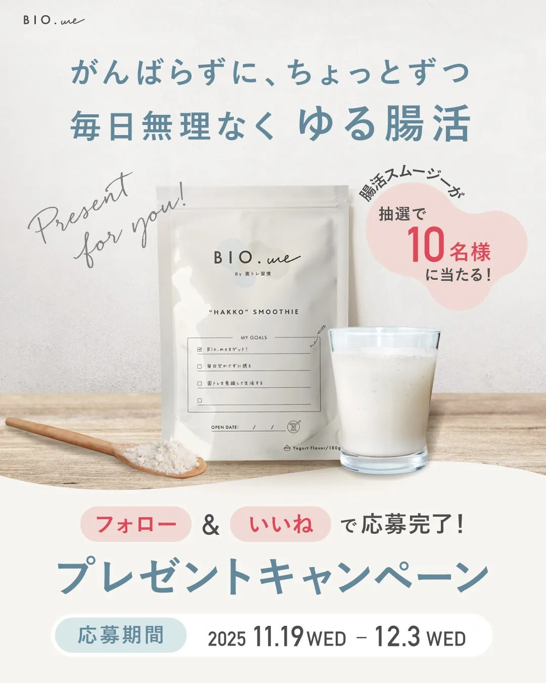 このキャンペーンは「ゆるっと自分をいたわる腸活キャンペーン」と名付けられ、2025年11月19日から12月3日までの期間中に、公式Instagramアカウントをフォローし、指定された投稿に「いいね!」をすることで応募できます。抽選で10名には約30日分の発酵スムージー「BIO.me」がプレゼントされるチャンスがあります。