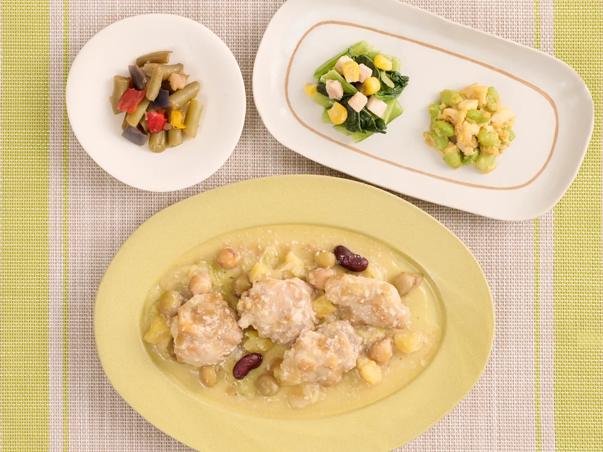 また、ほんのり甘いさつまいもや食感のよいキャベツを取り入れることで、栄養バランスも非常に良好。栄養や食欲が低下しがちな朝にぴったりです。これを麹スープで仕上げたことにより、優しい味わいに仕上げられています。メインディッシュだけでなく、副菜にもこだわり、彩り野菜のトマトドレッシング和えやコーンとベーコン入りの小松菜ソテー、フライドオニオンの旨味が感じられる枝豆と卵のサラダなど、目にも楽しめるメニューが揃っています。
