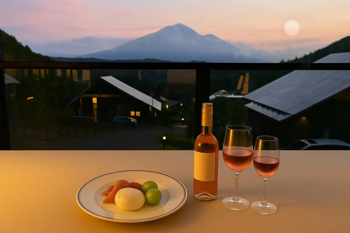特製『月見プレート』には、淡い桜色をした辛口ロゼワイン「vin rosé」が含まれており、フレッシュなベリーの香りが漂うこのワインは、地元「北軽井沢チーズ牧場」の自家製生チーズや、イタリアのプロシュート、信州産のシャインマスカットなどと共に提供されます。そして、夕暮れに染まる浅間山の絶景を眺めながら、贅沢なペアリングを楽しむことができます。