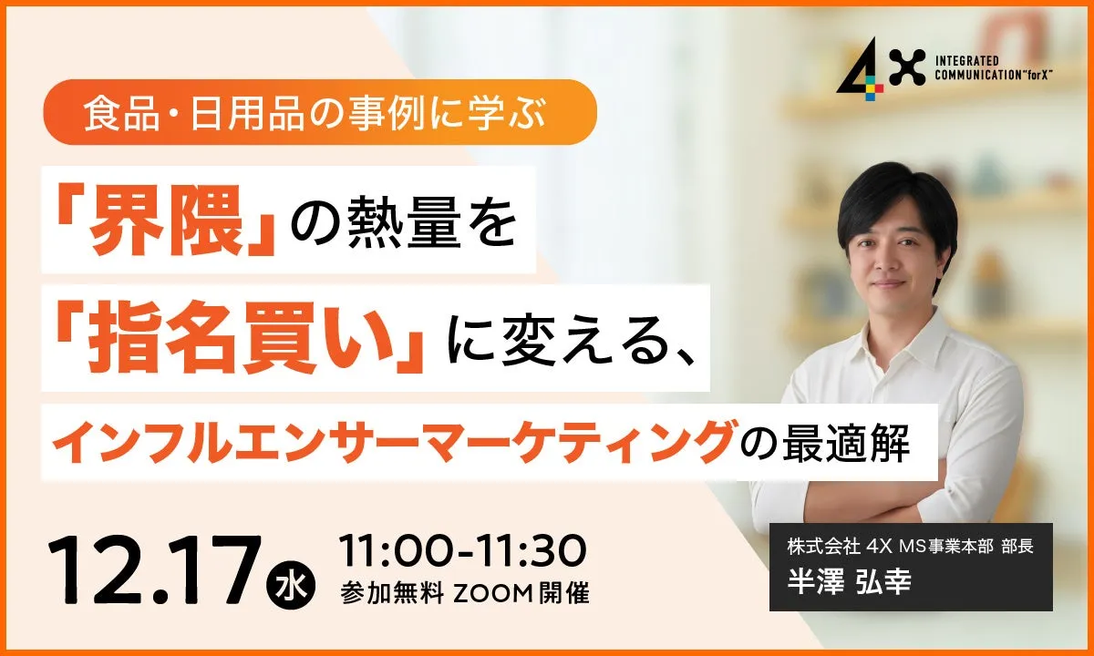 12月17日(水)、株式会社4Xが主催するウェビナー「食品・日用品の事例に学ぶ『界隈』の熱量を『指名買い』に変える、インフルエンサーマーケティングの最適解」が開催されます。近年、SNSにおける個人の発信が企業の売上に直結する時代となり、多くの企業がその波に乗ろうとしています。ただ、従来のインフルエンサー施策だけでは十分な効果を得られない企業が多いのが現状です。これに対処すべく、今回のウェビナーでは新たな戦略設計を探る内容に焦点を当てます。