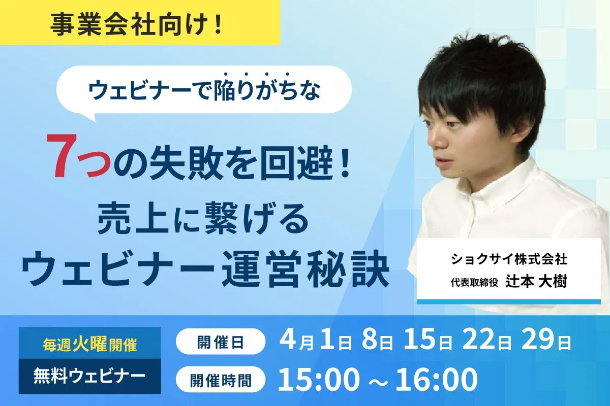 ショクサイ株式会社は、2025年4月に、「事業会社向け!ウェビナーで陥りがちな7つ失敗を回避!売上に繋げるウェビナー運営秘訣」という無料ウェビナーを開催します。このセミナーは、BtoBマーケティング担当者を対象にしており、ウェビナー実施時に抱える可能性のある課題について解説します。