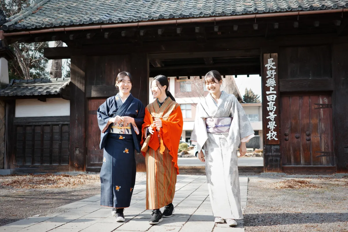 上田高等学校の生徒たちは、古城の門をモチーフにした歴史的な校舎の中で、グローバルスタディとして実施される授業の中で自ら着物を着用し、日常生活を送る実験を行いました。本プロジェクトには、2年生の宮本さんを含む8名が参加し、洋服の廃棄問題という社会的課題に対して、着物がどのように貢献できるかを考察しました。