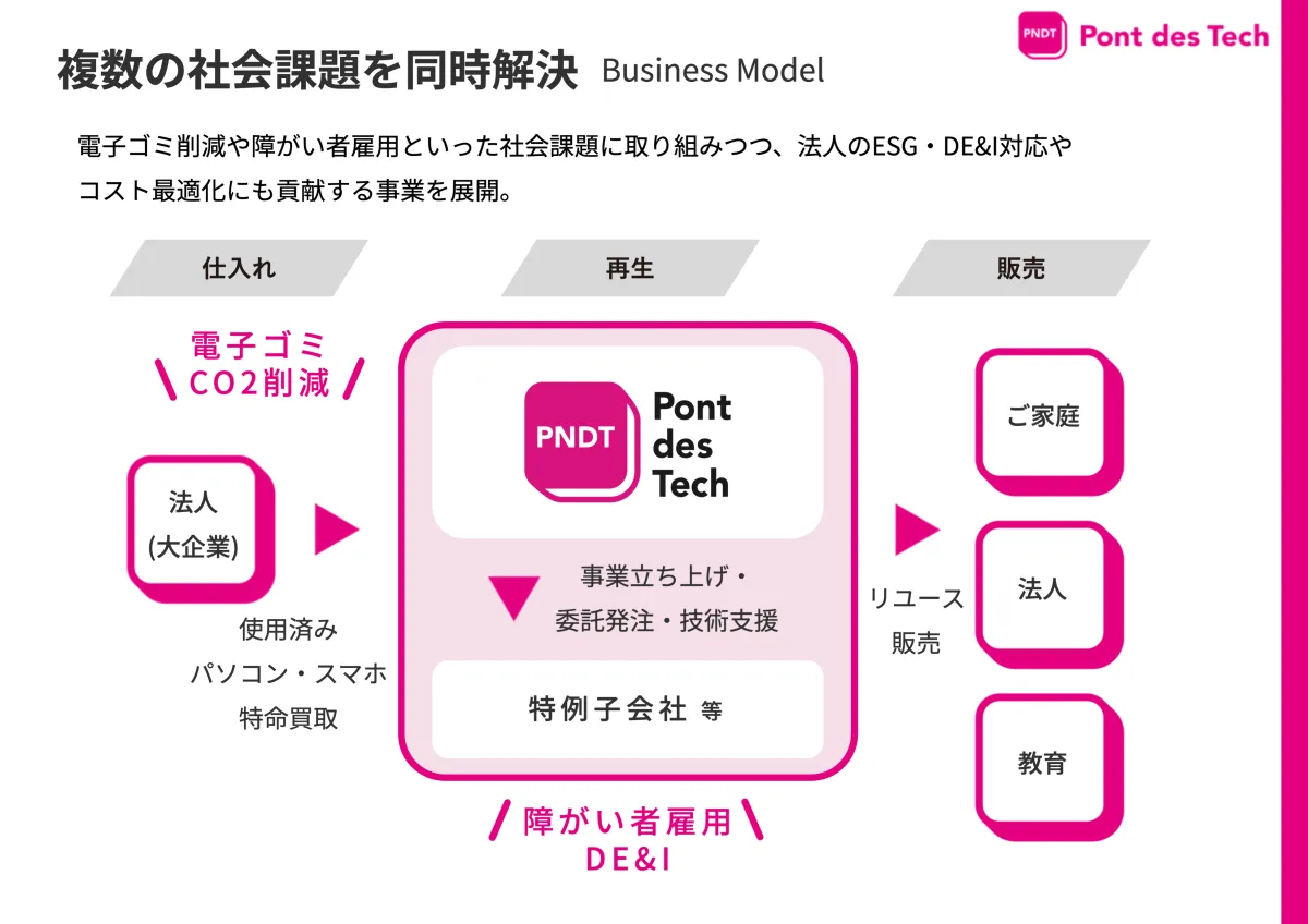 ポンデテックは、使用済みIT機器の再生・再流通を主な事業とする企業であり、障がい者の雇用促進にも力を入れています。特例子会社として、障がいを持つ方々が活躍できる職場環境を提供することで、社会における福祉の向上に貢献しているのです。