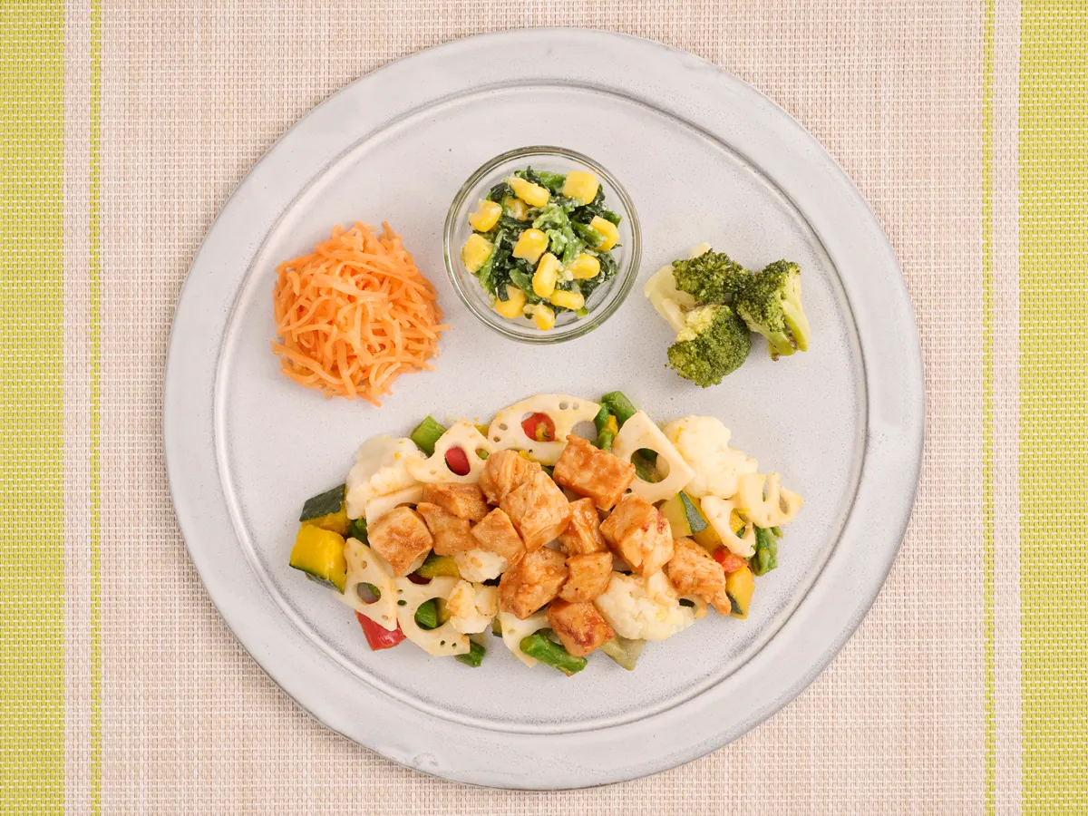 料理に使用される食材は、管理栄養士と専属のシェフが厳選しています。甘いかぼちゃ、シャキッとしたレンコン、旨みが豊かなカリフラワーなど、それぞれの野菜の良さを引き出し、飽きの来ない味わいを実現しています。また、サイドメニューには、さっぱりしたにんじんのラペや、クリーミーなほうれん草チーズコーンもあり、栄養バランスを整えています。
