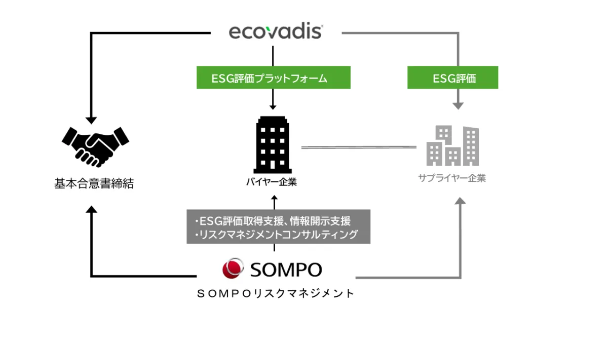 SOMPOリスクは、システム全体のリスクを包括的に管理することを目的とした企業で、全社的リスクマネジメントや防災・減災を支援する専門家です。一方、EcoVadisは、全世界で15万社以上のサプライヤーの持続可能性を評価し、そのスコアを元に企業がESGリスクを評価できるプラットフォームを提供しています。