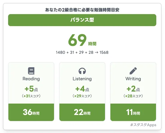 英検(R)の一次試験結果が発表される際、多くの受験生が合格や不合格の判定を受けます。合格者は次のスピーキング試験に進むことができますが、不合格となった場合、次回の受験に向けた具体的な戦略が必要です。「次はどうすれば合格できるのか」や「どのくらいの勉強が必要なのか」といった不安を抱えた受験生は少なくありません。このような状況を打開するために、スタディスタジオは「合格時間ナビ」を開発しました。