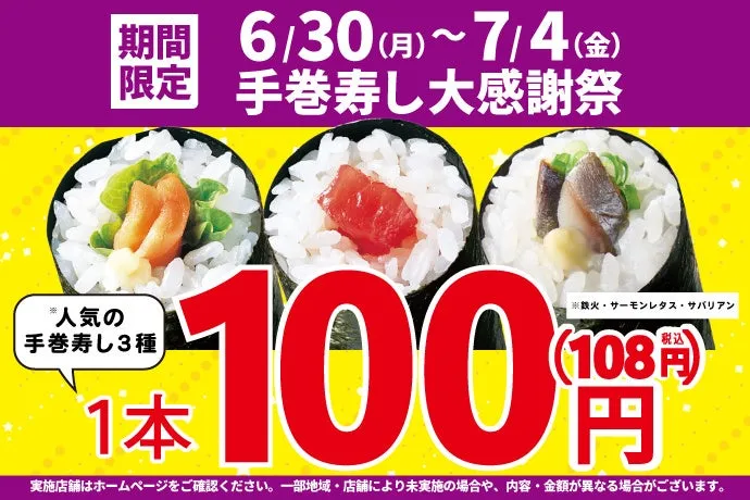 「手巻寿し大感謝祭」の目玉は、なんと言ってもその価格です。通常価格で考えれば、いずれの手巻寿しもかなりの割引が適用され、全て100円(税込108円)で提供されます。ここでは、特に人気の3種類の手巻寿しが紹介されています: