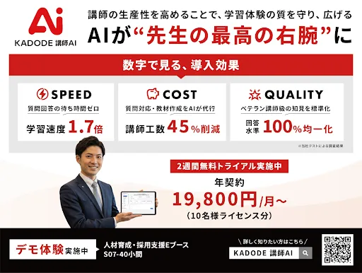 - - 出展内容: KADODE 講師AI、KADODE Academy ライトプラン