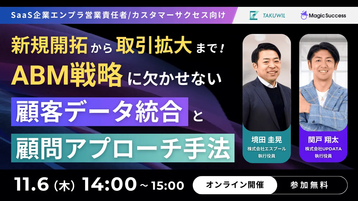 株式会社UPDATAは、2025年11月6日14時から、ABM(アカウント・ベースド・マーケティング)戦略に必要な顧客データ統合と顧問アプローチの技法をテーマにしたウェビナーを開催します。本イベントは、特にカスタマーサクセスやカスタマーサポート業務に従事している方々に向けて設計されており、参加は無料です。