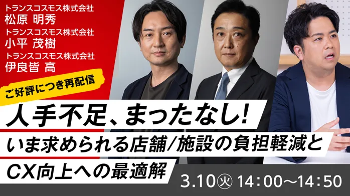 トランスコスモス株式会社は、2026年3月10日(火)にオンラインセミナーを開催します。このセミナーは「人手不足、まったなし!」をテーマにしており、顧客体験(CX)向上と店舗運営の負担軽減に向けた具体的な解決策を提案するものです。