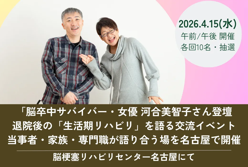 2026年4月15日(水)、名古屋で脳卒中サバイバーで女優の河合美智子さんを迎え、リハビリについて語り合う交流イベント「リハセンツアーin名古屋」が開催されます。本イベントは、脳卒中を経験した当事者やその家族、リハビリ専門職が同じ場で意見を交換し、生活期リハビリの重要性について理解を深めることを目的としています。