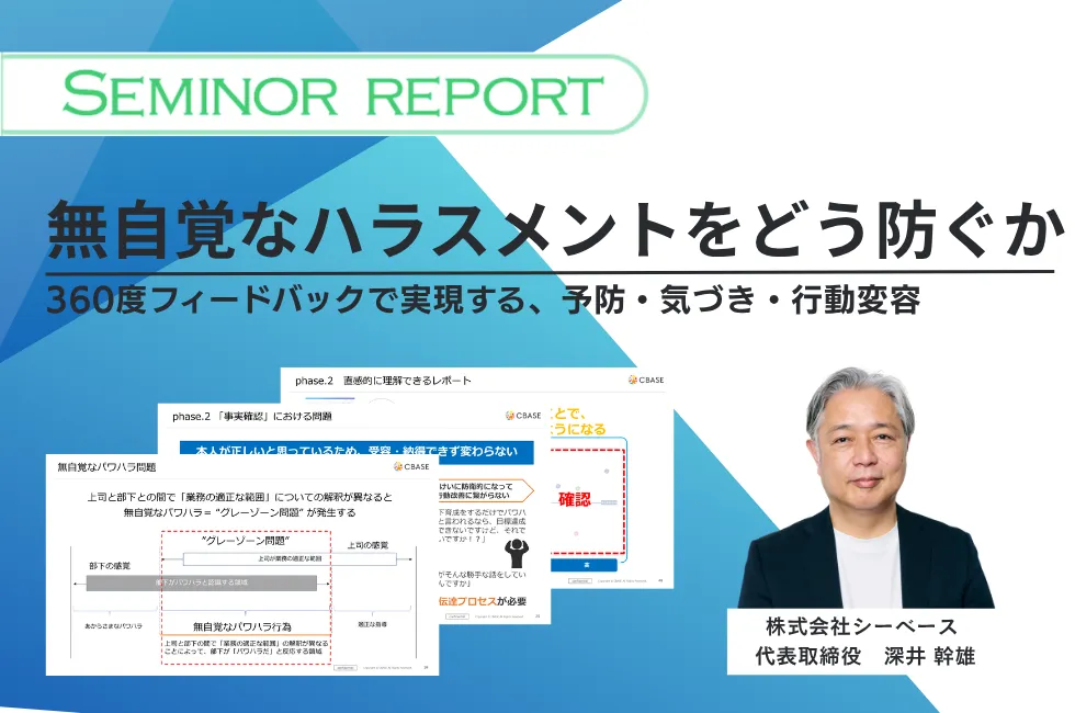 近年、職場でのハラスメント問題が注目されています。特に無自覚なパワハラやセクハラといった問題は、当事者に悪意がないため、見過ごされがちです。株式会社シーベースが開催したセミナーでは、効果的なハラスメント対策として360度フィードバックを提案しました。