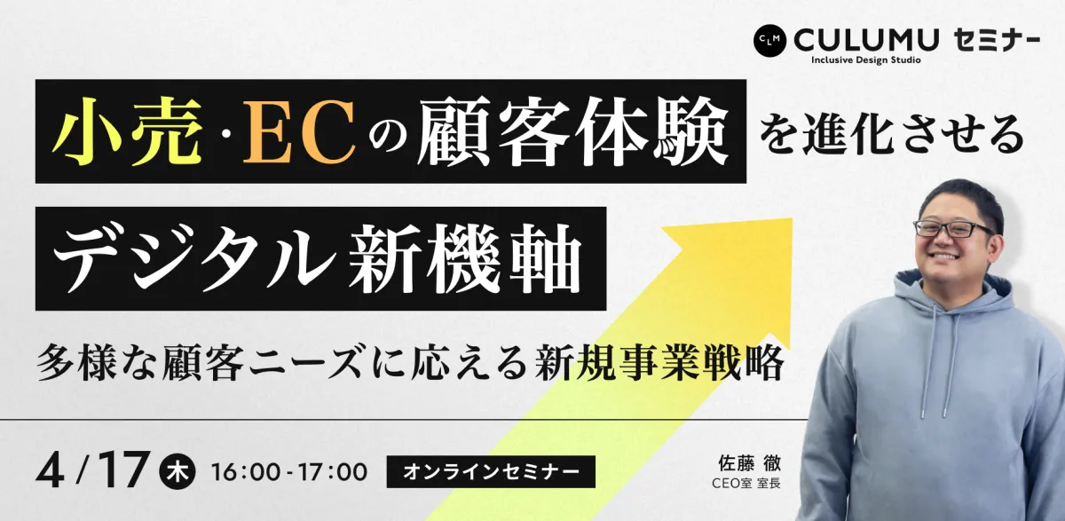 2025年4月17日(木)16:00から、オンラインセミナー『小売・ECの顧客体験を進化させるデジタル新機軸 〜多様な顧客ニーズに応える新規事業戦略〜』が開催されます。主催は株式会社STYZのインクルーシブデザインスタジオCULUMUで、参加は無料です。