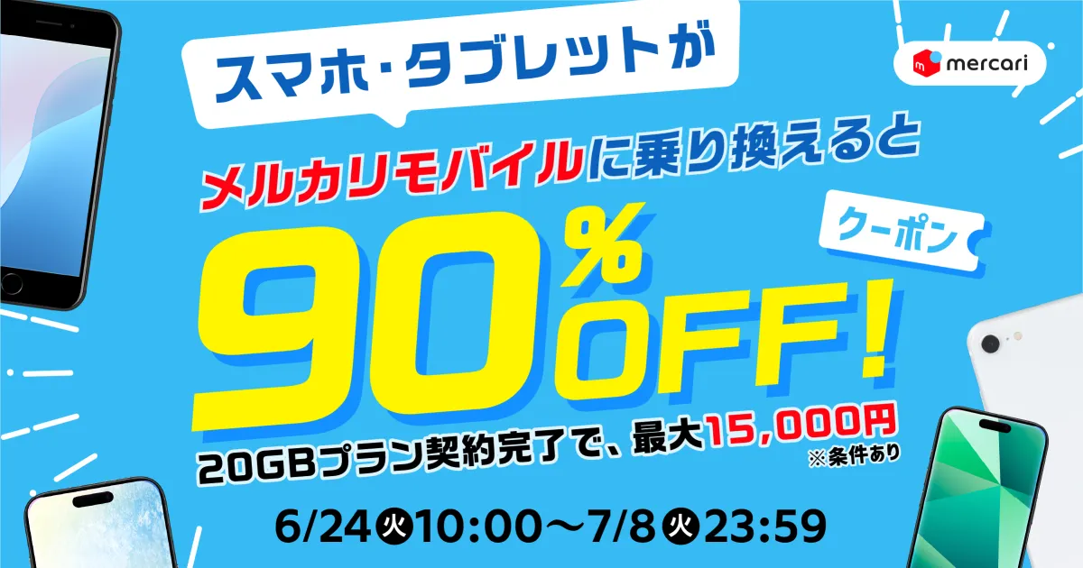 株式会社メルカリが、2025年6月24日から「メルカリモバイルスマホセット販売キャンペーン」を開始することを発表しました。このキャンペーンでは、他社から「メルカリモバイル」への乗り換えを利用する方に対し、メルカリで購入するスマートフォンやタブレット本体が最大90%オフとなるクーポンが提供されます。