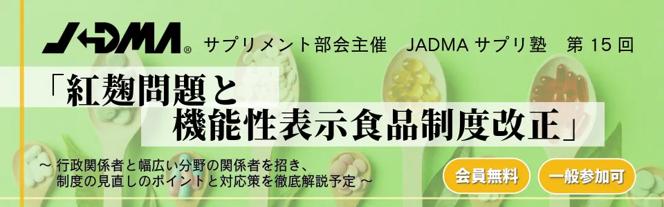 公益社団法人日本通信販売協会(JADMA)が主催する「サプリ塾」第15回が、2024年10月4日(金)にオンラインで開催されます。このセミナーでは、最近の機能性表示食品制度の改正に伴う重要なテーマ、特に紅麹問題に焦点を当て、専門家による詳しい解説が行われます。