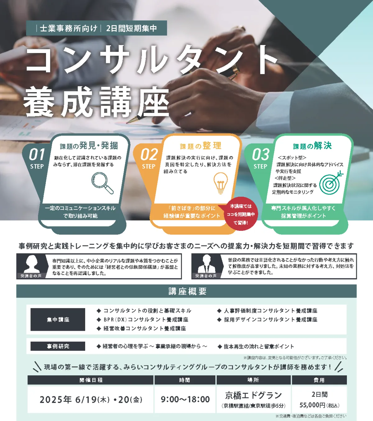 みらいコンサルティンググループは、1987年から中堅・中小企業の経営支援を行っており、税務会計だけでなく、デジタル技術の活用や新規事業への挑戦まで多岐にわたる専門サービスを展開してきました。そのビジョンは「Co-Creation for Innovative MIRAI 2030」として、人と企業が共に学び・成長する未来を描いています。