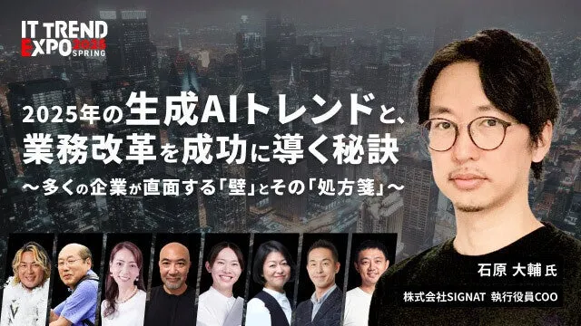 東京を拠点として活動する株式会社SIGNATEが、2025年春に開催される「ITトレンドEXPO2025 Spring」で重要な講演を行うことになりました。執行役員COOの石原大輔氏が登壇し、生成AIに関する最新のトレンドと業務改革成功のための秘訣を探る予定です。