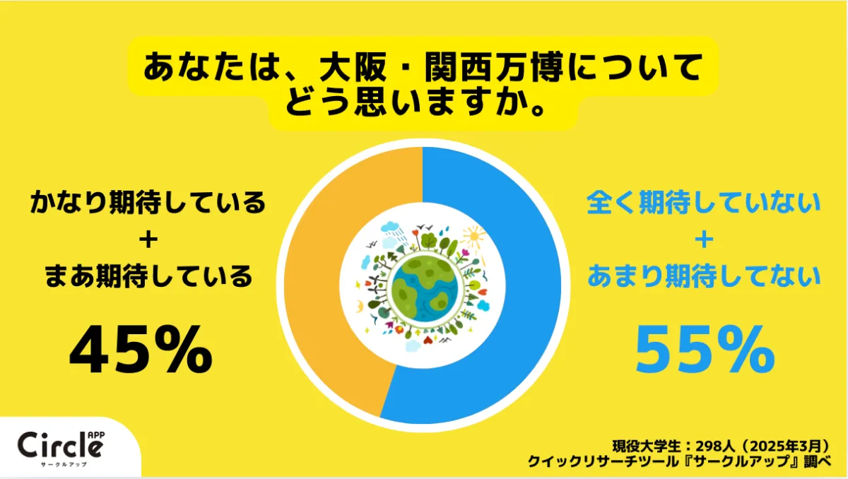 大阪・関西万博が2025年4月13日から開催されることが決定し、連日メディアやSNSでその話題が取り上げられています。しかし、現役大学生たちはこの万博についてどう思っているのでしょうか。株式会社RECCOOのZ世代向けリサーチサービス『サークルアップ』が行った調査では、大学生の55%が万博に「期待していない」と回答しました。
