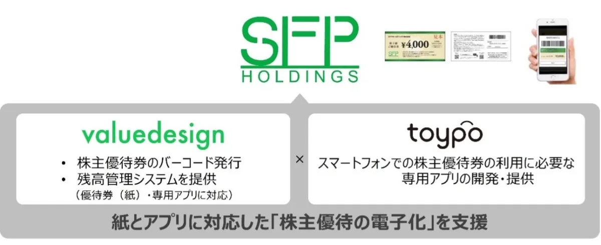 最近、株式会社トイポと株式会社バリューデザインがSFPホールディングスの株主優待券の電子化を支援することを発表しました。これにより、株主様の利便性が大きく向上することが期待されています。具体的には、専用アプリの開発や残高管理システムの導入により、使用方法が多様化し、よりスムーズに優待券を利用できるようになります。