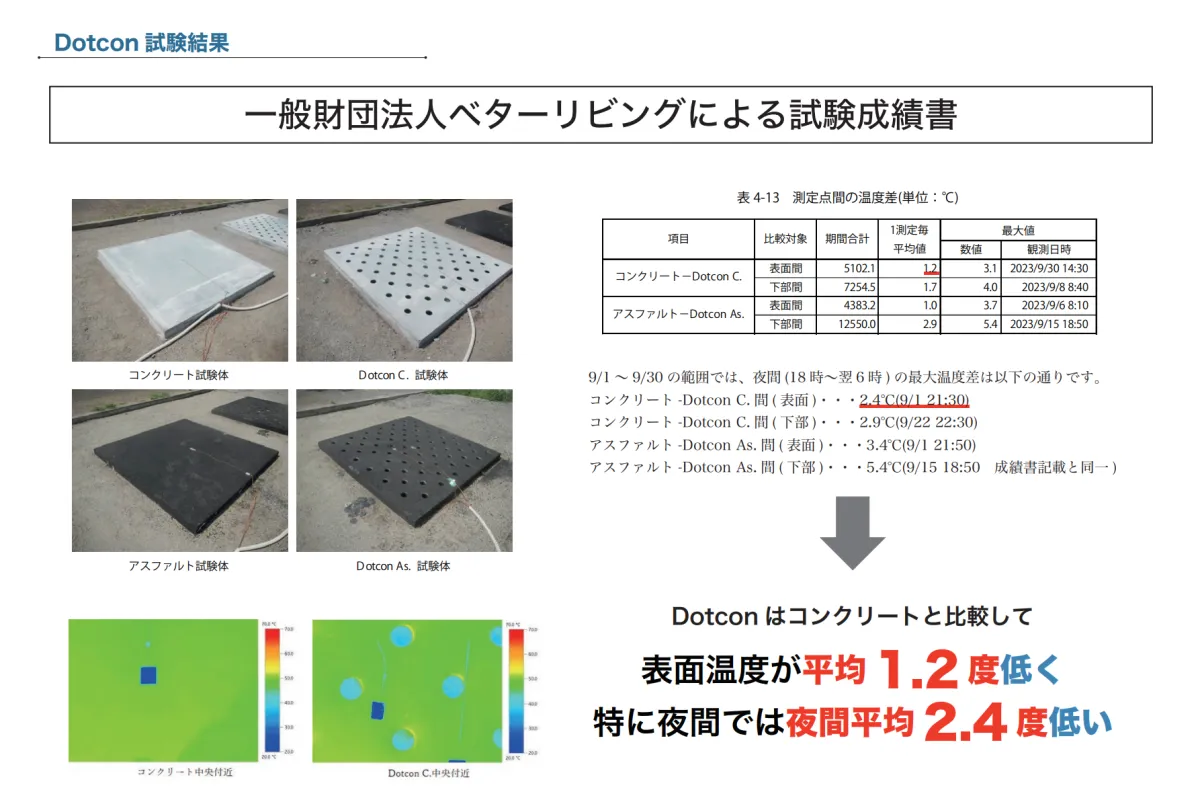 2023年9月に行われた測定によると、Dotcon舗装は通常のコンクリート舗装よりも表面温度が約1.2℃低く、夜間には最大で2.4℃の低下が確認されました。また、地中の路盤温度も平均1.7℃、最大で4.0℃低下したことが分かりました。これらの結果から、Dotcon工法はその名に恥じない温度抑制効果を持っていることが実証されています。